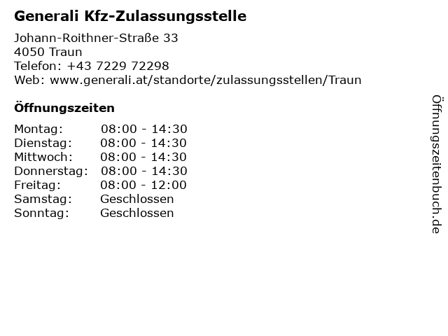 Öffnungszeiten Generali Kfz-Zulassungsstelle in Traun anzeigen | |