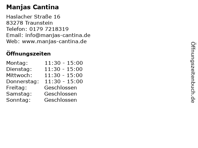 | Öffnungszeiten Manjas Cantina in Traunstein anzeigen | |