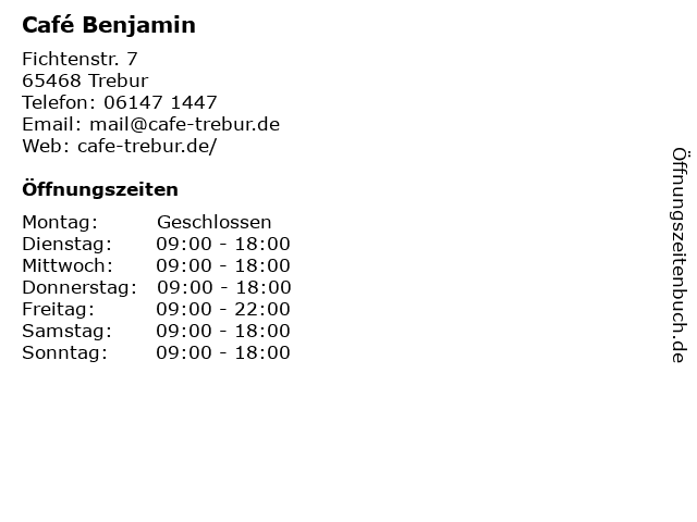 | Öffnungszeiten Café Benjamin in Trebur anzeigen | |