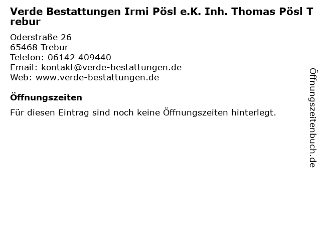 | Verde Bestattungen Irmi Pösl e.K. Inh. Thomas Pösl Trebur anrufen | |