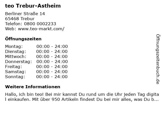 | Öffnungszeiten teo Trebur-Astheim in Trebur anzeigen | |