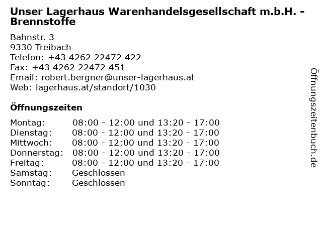 1 Unser Lagerhaus Warenhandelsgesellschaft m.b.H. - Agrar (Entfernung: 0,00 km) Bahnstr. 3, 9330 Treibach 2 Unser Lagerhaus Warenhandelsgesellschaft m.b.H. - Bau & Garten (Entfernung: 0,00 km) Bahnstraße 3, 9330 Treibach 3 Unser Lagerhaus Warenhandelsgesellschaft m.b.H. - Tankstelle (Entfernung: 0,00 km) Bahnstrasse 3, 9330 Treibach 4 Unser Lagerhaus Warenhandelsgesellschaft m.b.H. - Landmaschinen-Handel (Entfernung: 0,08 km) Funderstr. 18, 9330 Treibach 5 Unser Lagerhaus Warenhandelsgesellschaft m.b.H. - Werkstätte Landmaschinen (Entfernung: 0,08 km) Funderstr. 18, 9330 Treibach 6 Unser Lagerhaus Warenhandelsgesellschaft m.b.H. - Agrar und Bau und Garten (Entfernung: 10,65 km) Lastenstr. 2, 9360 Friesach |