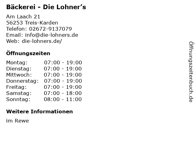 | Öffnungszeiten Bäckerei - Die Lohner’s in Treis-Karden anzeigen | |