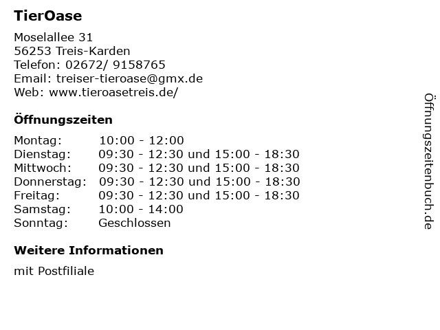 | Öffnungszeiten TierOase in Treis-Karden anzeigen | |