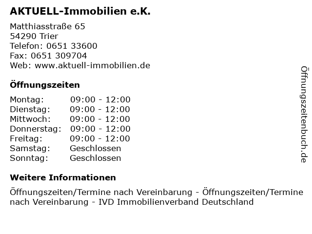 | Öffnungszeiten AKTUELL-Immobilien e.K. in Trier anzeigen | |