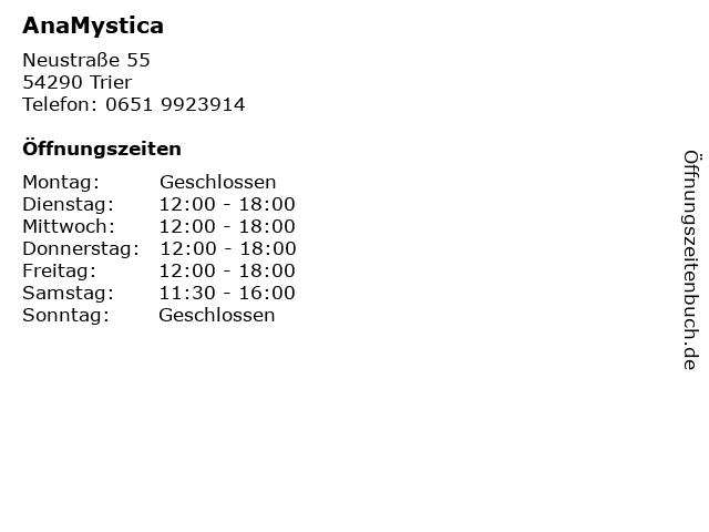 | Öffnungszeiten AnaMystica in Trier anzeigen | |