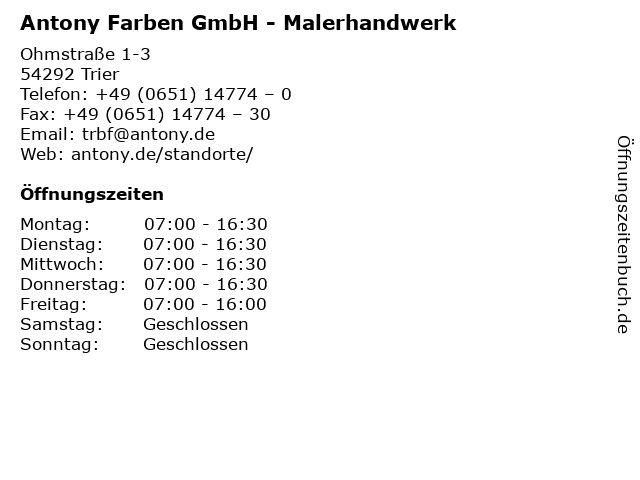 4 Wiedemann GmbH Fachgesch.f. Tapeten, Farben u. Bod (Entfernung: 6,71 km) In den Schlimmfuhren 6a, 54338 Schweich 5 Baby Boom... die Antwort auf's Kinderkriegen, Lisa Antony (Entfernung: 6,89 km) Bernhard-Becker-Str. 4, 54338 Schweich 6 |