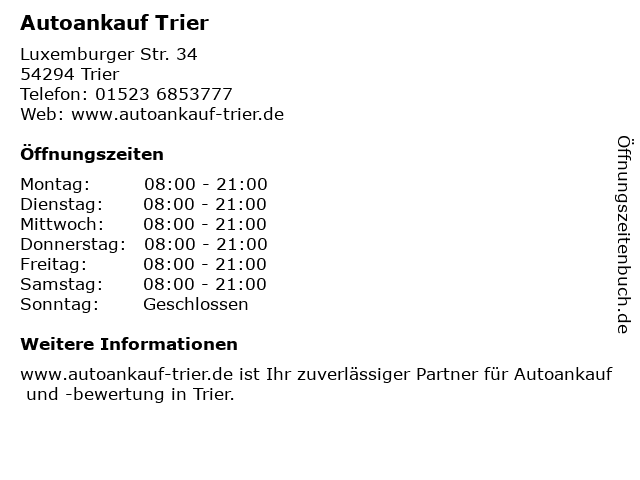 | Öffnungszeiten Autoankauf Trier in Trier anzeigen | |