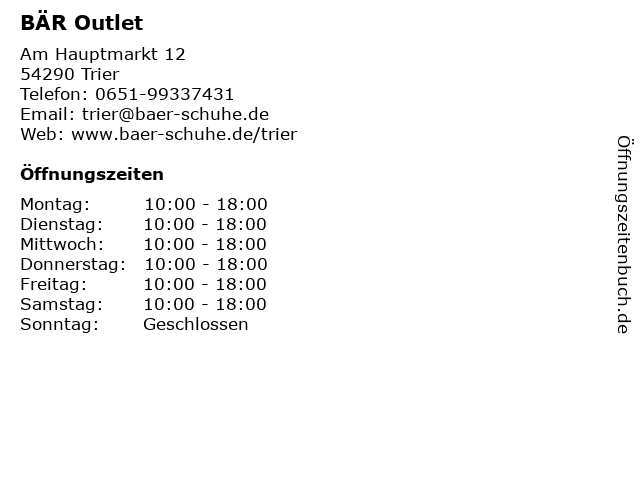 | Öffnungszeiten BÄR Outlet in Trier anzeigen | |