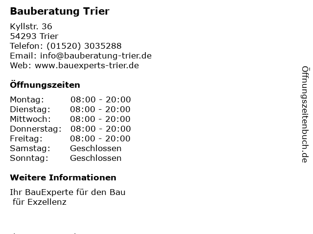 | Öffnungszeiten Bauberatung Trier in Trier anzeigen | |