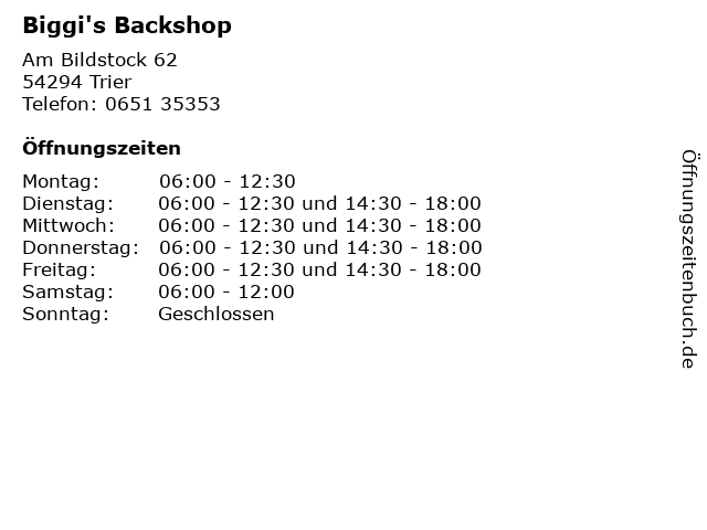 | Öffnungszeiten Biggi's Backshop in Trier anzeigen | |