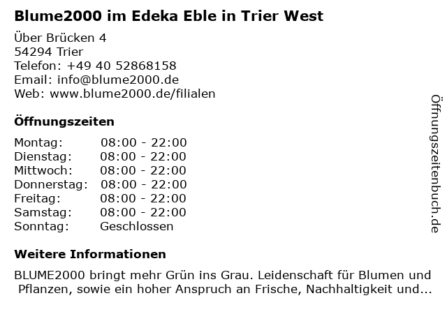 Branchen & Suchbegriffe zu Blume2000 im Edeka Eble in Trier West:blume2000, eble, edeka, geschenkartikel, pflanzen, schnittblumen, sträuße, west |