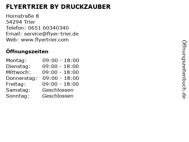 | Öffnungszeiten FLYERTRIER BY DRUCKZAUBER in Trier anzeigen | |