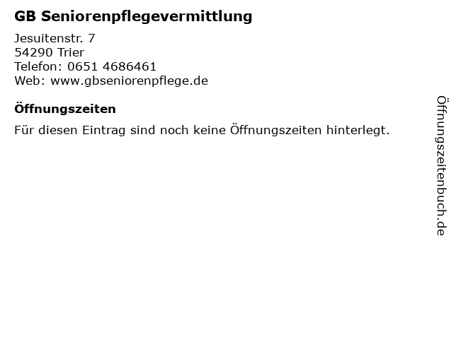 | Öffnungszeiten GB Seniorenpflegevermittlung in Trier anzeigen | |
