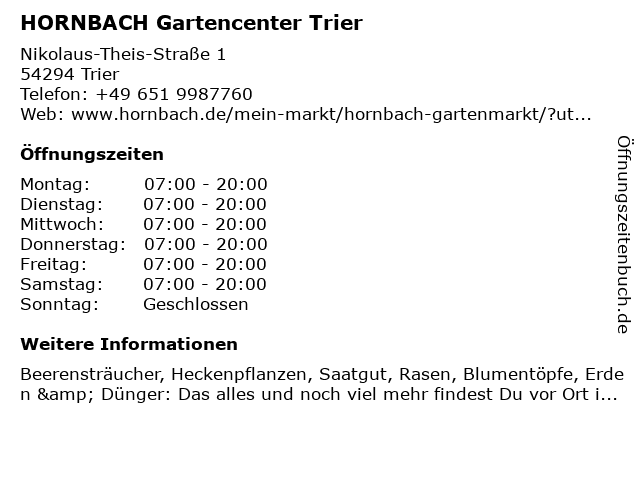 | Öffnungszeiten HORNBACH Gartencenter Trier in Trier anzeigen | |