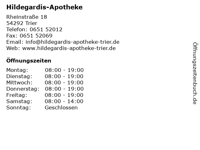 | Öffnungszeiten Hildegardis-Apotheke in Trier anzeigen | |