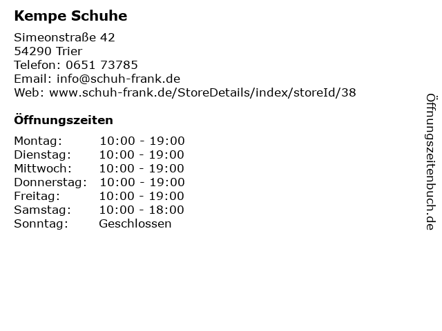 | Öffnungszeiten Kempe Schuhe in Trier anzeigen | |