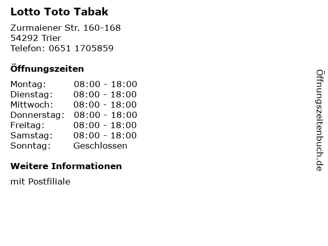 | Öffnungszeiten Lotto Toto Tabak in Trier anzeigen | |