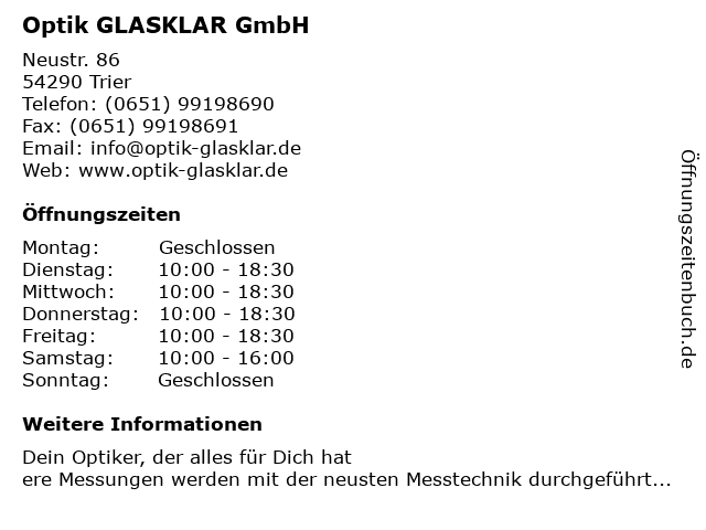 | Öffnungszeiten Optik GLASKLAR GmbH in Trier anzeigen | |