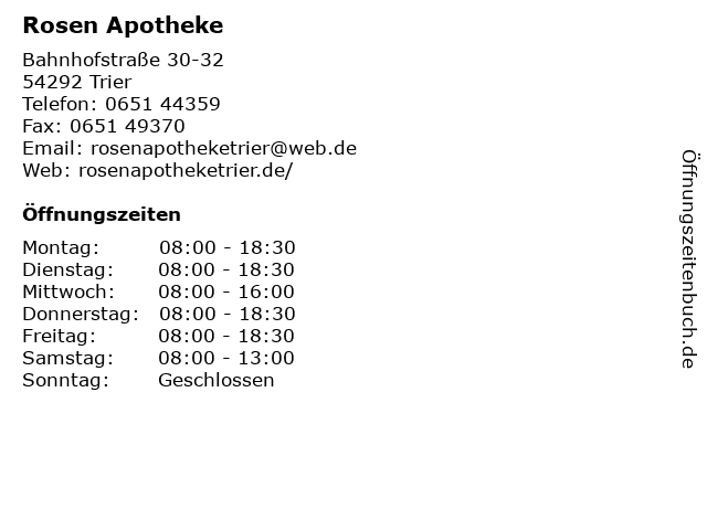 | Öffnungszeiten Rosen Apotheke in Trier anzeigen | |