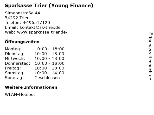 | Öffnungszeiten Sparkasse Trier (Young Finance) in Trier anzeigen | |