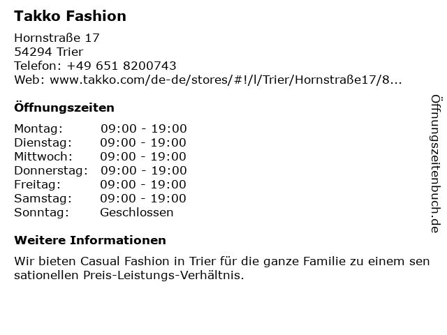 | Öffnungszeiten Takko Fashion in Trier anzeigen | |