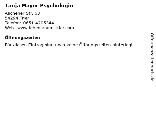| Öffnungszeiten Tanja Mayer Psychologin in Trier anzeigen | |