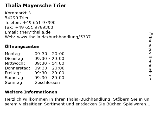 | Öffnungszeiten Thalia Mayersche Trier in Trier anzeigen | |