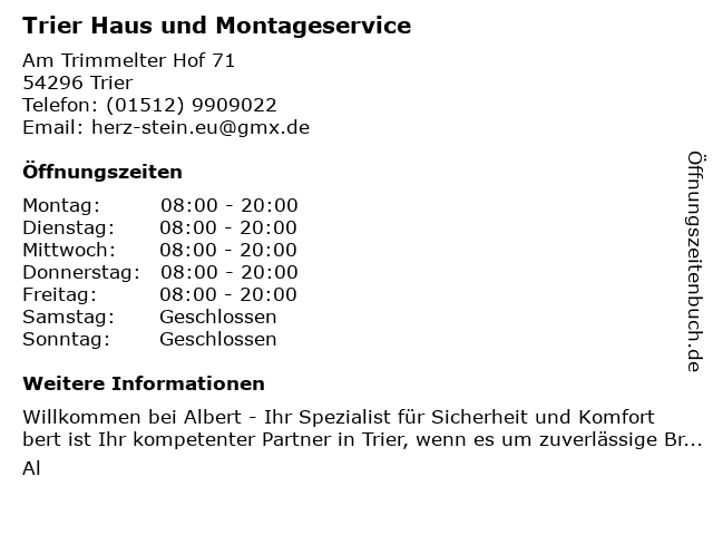 | Öffnungszeiten Trier Haus und Montageservice in Trier anzeigen | |