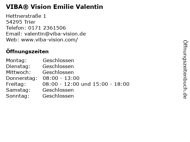 | Öffnungszeiten VIBA® Vision Emilie Valentin in Trier anzeigen | |