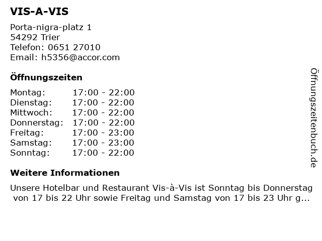 | Öffnungszeiten VIS-A-VIS in Trier anzeigen | |