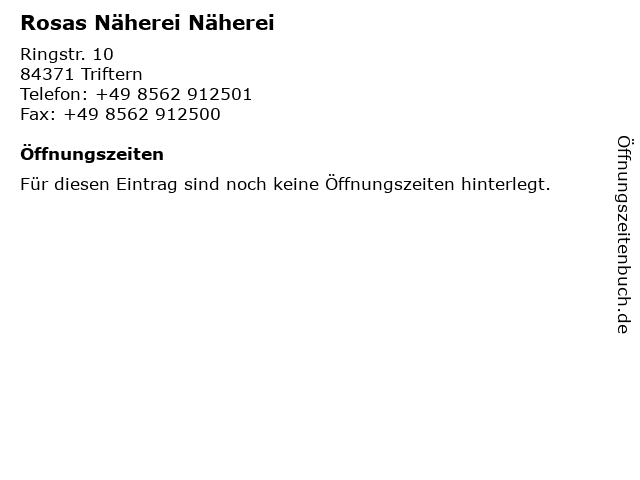 | Telefonnummer Rosas Näherei Näherei in Triftern (+49 8562 912501) anrufen | |