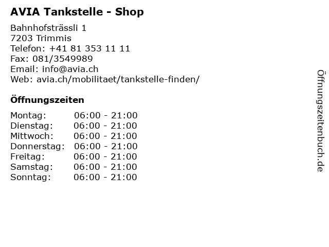 | Öffnungszeiten AVIA Tankstelle - Shop in Trimmis anzeigen | |