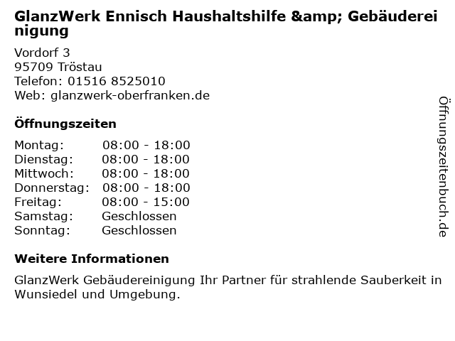 Branchen & Suchbegriffe zu GlanzWerk Ennisch Haushaltshilfe & Gebäudereinigung:ennisch, fensterreinigung, gebäudereinigung, glanzwerk, haushaltshilfe, häusliche pflege |