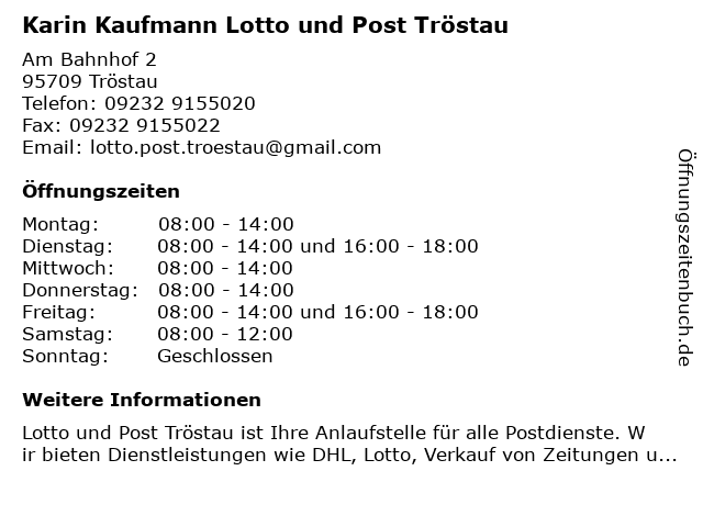 Branchen & Suchbegriffe zu Karin Kaufmann Lotto und Post Tröstau:karin, kaufmann, lotto, post, tröstau |