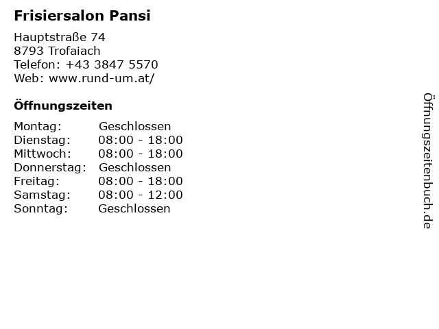 | Öffnungszeiten Frisiersalon Pansi in Trofaiach anzeigen | |