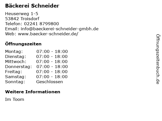 | Öffnungszeiten Bäckerei Schneider in Troisdorf anzeigen | |
