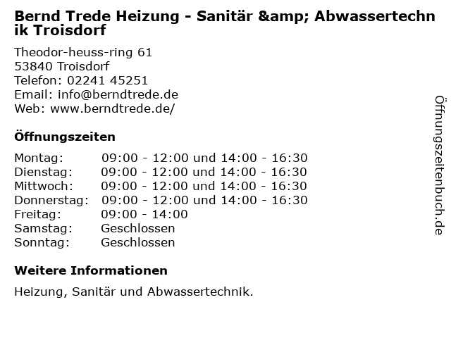 Branchen & Suchbegriffe zu Bernd Trede Heizung - Sanitär & Abwassertechnik Troisdorf:abwassertechnik, anbieter für pumpen, anbieter für wasserenthärtungsanlagen, bernd, boiler-anbieter, heizung, hlk-montage, kanal- und abflussreinigung, klärgrubenreinigung, luftkanalreinigungsdienst, sanitär, trede |