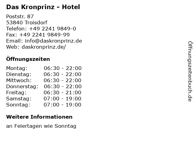 | Öffnungszeiten Das Kronprinz - Hotel in Troisdorf anzeigen | |