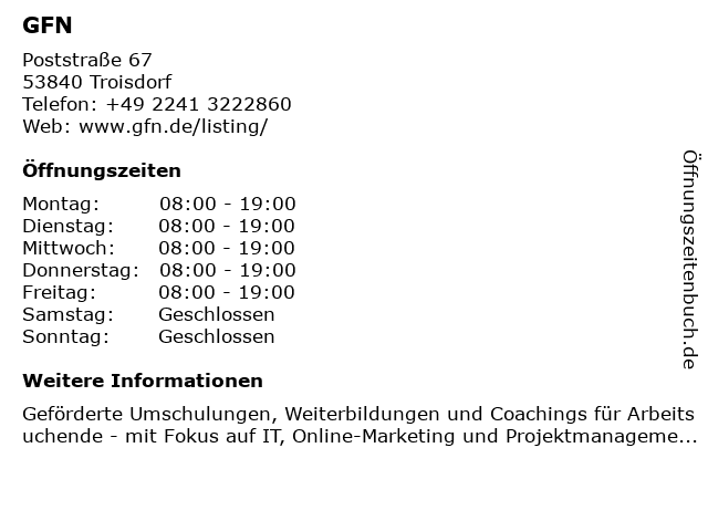 | Öffnungszeiten GFN in Troisdorf anzeigen | |