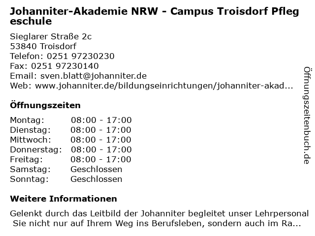 Branchen & Suchbegriffe zu Johanniter-Akademie NRW - Campus Troisdorf Pflegeschule:akademie, campus, gemeinnützige organisation, hilfsorganisation, johanniter, nrw, pflegeschule, sozialarbeit, verband, wohlfahrtseinrichtung |