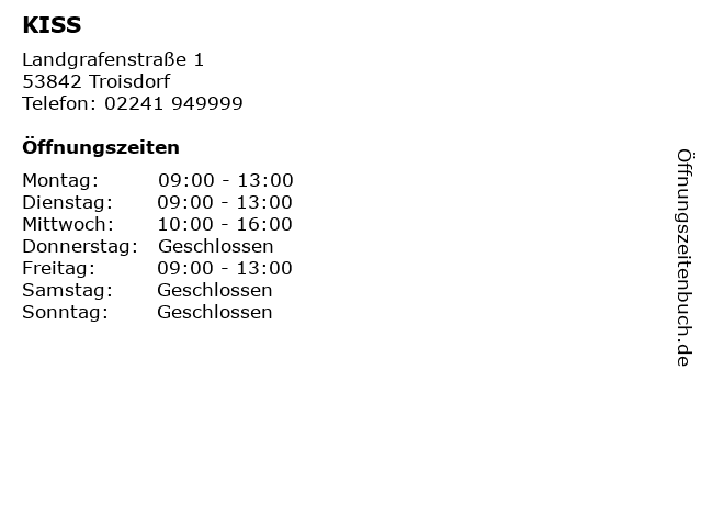 | Öffnungszeiten KISS in Troisdorf anzeigen | |