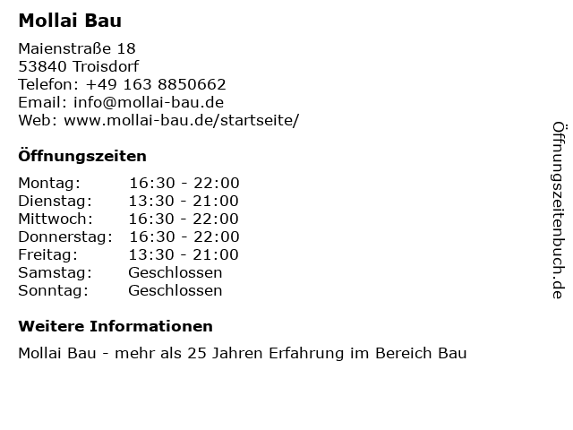| Öffnungszeiten Mollai Bau in Troisdorf anzeigen | |
