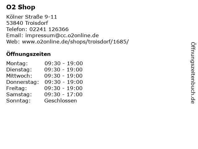 | Öffnungszeiten O2 Shop in Troisdorf anzeigen | |