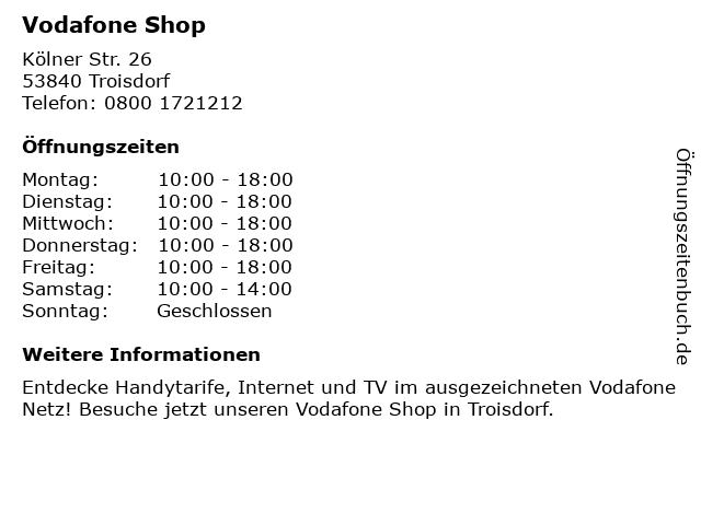 | Öffnungszeiten Vodafone Shop in Troisdorf anzeigen | |