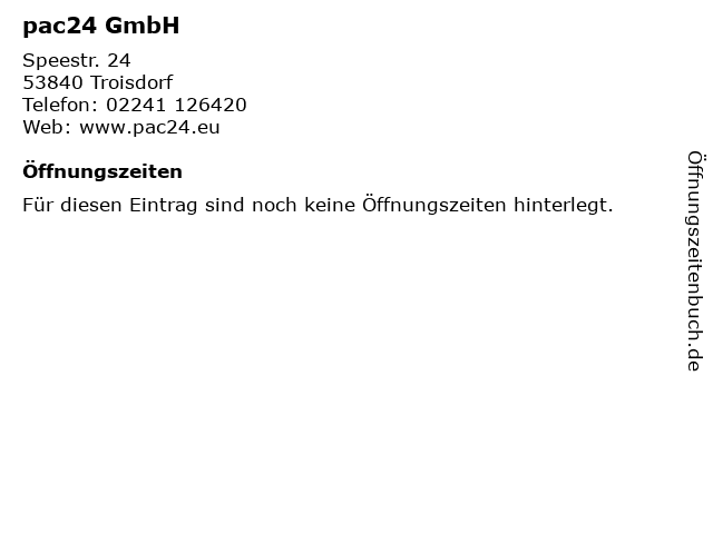 | Öffnungszeiten pac24 GmbH in Troisdorf anzeigen | |