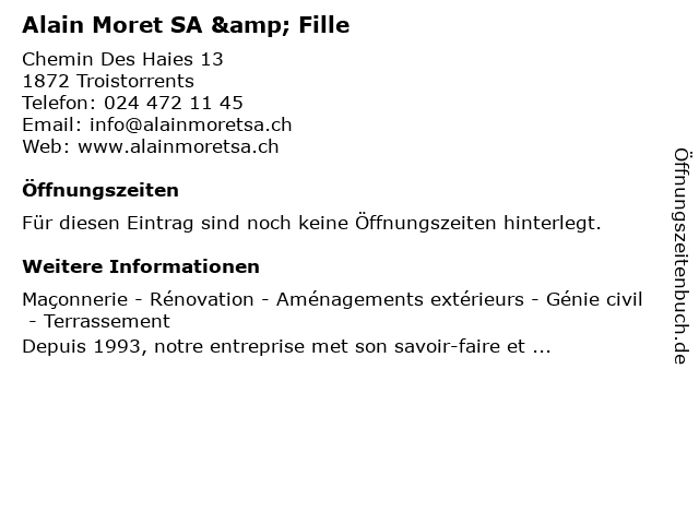 | Öffnungszeiten Alain Moret SA & Fille in Troistorrents anzeigen | |