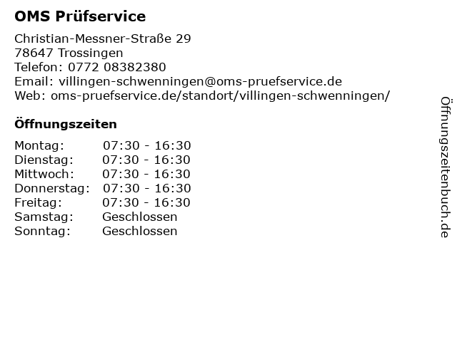 | Öffnungszeiten OMS Prüfservice in Trossingen anzeigen | |
