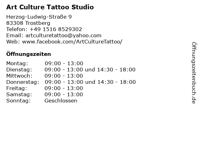 | Öffnungszeiten Art Culture Tattoo Studio in Trostberg anzeigen | |