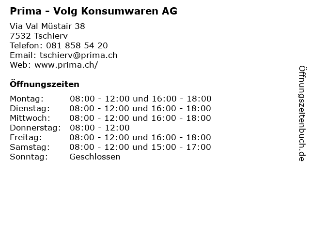 Telefonnummer Prima - Volg Konsumwaren AG in Tschierv (081 858 54 20) anrufen
